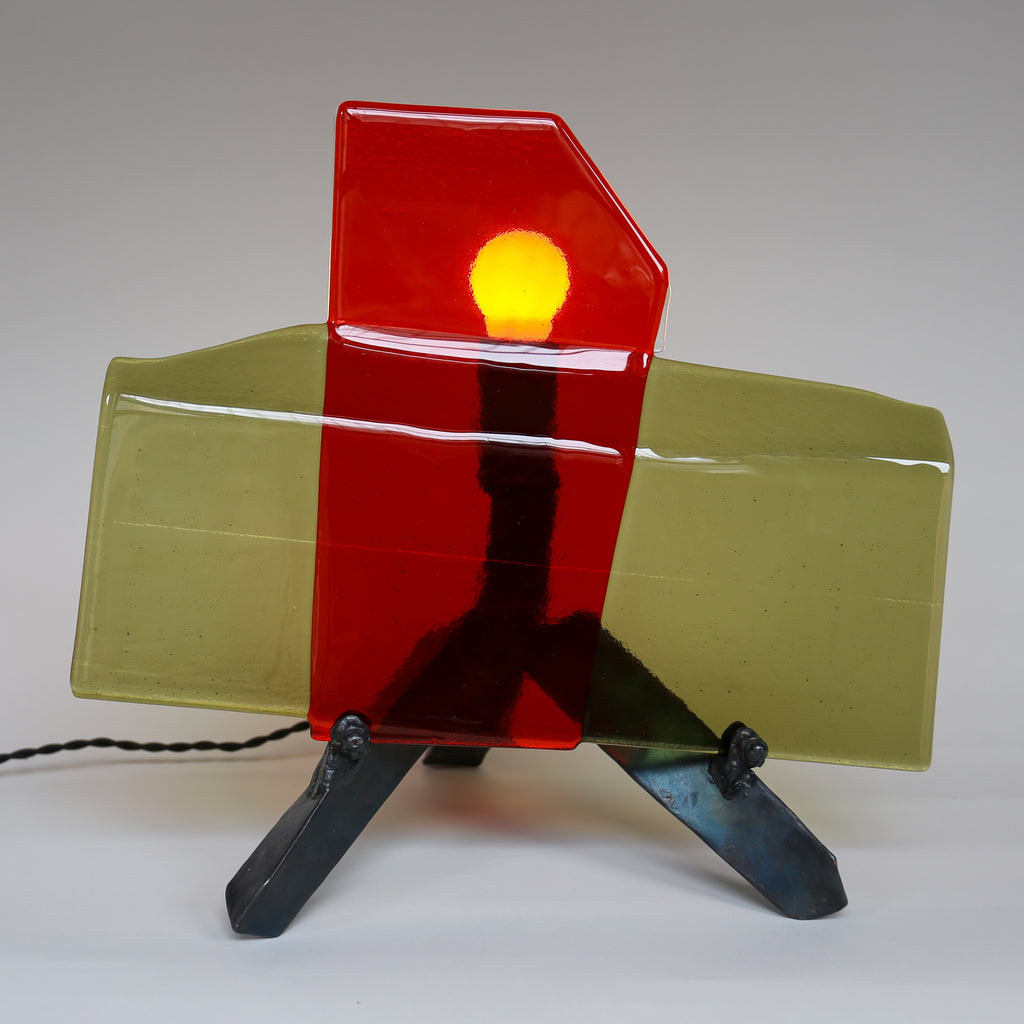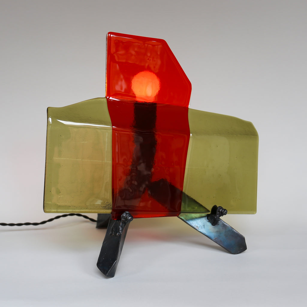 Blackened steel lamp base; slumped glass shade in yellow and circus red